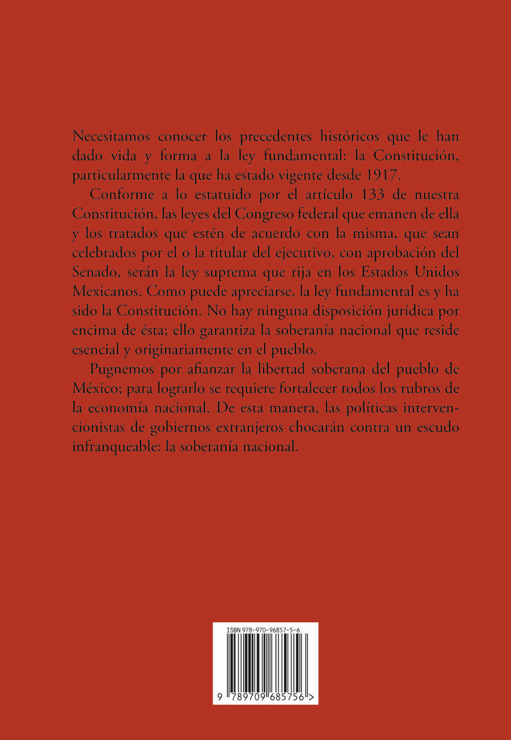 Necesitamos conocer los precedentes históricos que le han dado vida y forma a la ley fundamental: la Constitución, particularmente la que ha estado vigente desde 1917. Conforme a lo estatuido por el artículo 133 de nuestra Constitución, las leyes del Congreso federal que emanen de ella y los tratados que estén de acuerdo con la misma, que sean celebrados por el o la titular del ejecutivo, con aprobación del Senado, serán la ley suprema que rija en los Estados Unidos Mexicanos. Como puede apreciarse, la ley fundamental es y ha sido la Constitución. No hay ninguna disposición jurídica por encima de ésta; ello garantiza la soberanía nacional que reside esencial y originariamente en el pueblo. Pugnemos por afianzar la libertad soberana del pueblo de México; para lograrlo se requiere fortalecer todos los rubros de la economía nacional. De esta manera, las políticas intervencionistas de gobiernos extranjeros chocarán contra un escudo infranqueable: la soberanía nacional.