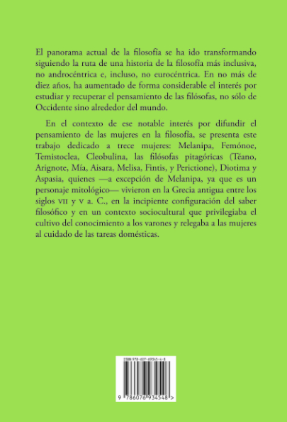 El panorama actual de la filosofía se ha ido transformando siguiendo la ruta de una historia de la filosofía más inclusiva, no androcéntrica e, incluso, no eurocéntrica. En no más de diez años, ha aumentado de forma considerable el interés por estudiar y recuperar el pensamiento de las filósofas, no sólo de Occidente sino alrededor del mundo. En el contexto de ese notable interés por difundir el pensamiento de las mujeres en la filosofía, se presenta este trabajo dedicado a trece mujeres: Melanipa, Femónoe, Temistoclea, Cleobulina, las filósofas pitagóricas (Téano, Arignote, Mía, Aisara, Melisa, Fintis, y Perictione), Diotima y Aspasia, quienes —a excepción de Melanipa, ya que es un personaje mitológico— vivieron en la Grecia antigua entre los siglos VII y V a. C., en la incipiente configuración del saber filosófico y en un contexto sociocultural que privilegiaba el cultivo del conocimiento a los varones y relegaba a las mujeres al cuidado de las tareas domésticas.