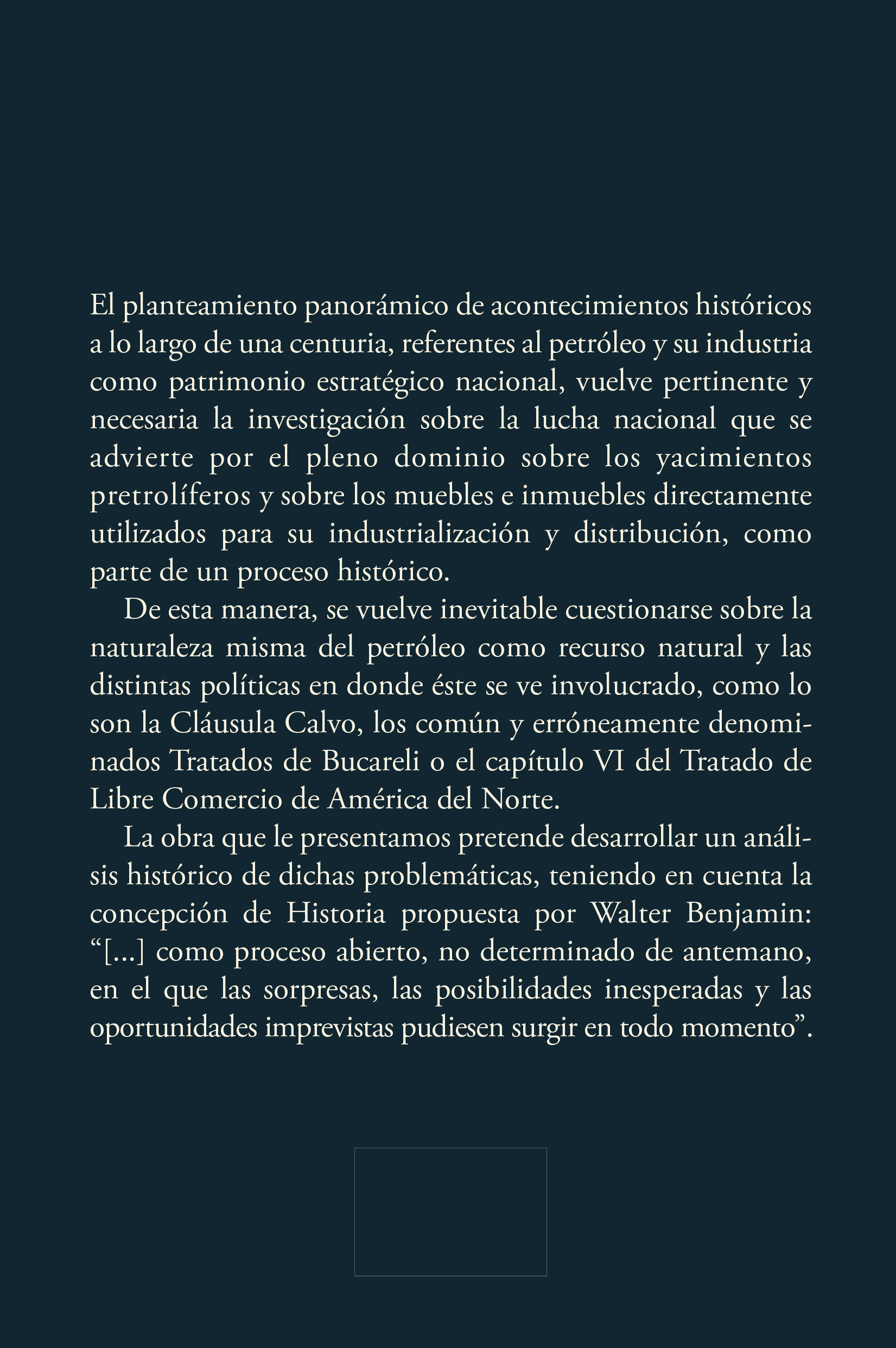 De esta manera, se vuelve inevitable cuestionarse sobre la naturaleza misma del petróleo como recurso natural y las distintas políticas en donde éste se ve involucrado, como lo son la Cláusula Calvo, los común y erróneamente denominados Tratados de Bucareli o el capítulo VI del Tratado de Libre Comercio de América del Norte. La obra que le presentamos pretende desarrollar un análisis histórico de dichas problemáticas, teniendo en cuenta la concepción de Historia propuesta por Walter Benjamin: “[…] como proceso abierto, no determinado de antemano, en el que las sorpresas, las posibilidades inesperadas y las oportunidades imprevistas pudiesen surgir en todo momento”.